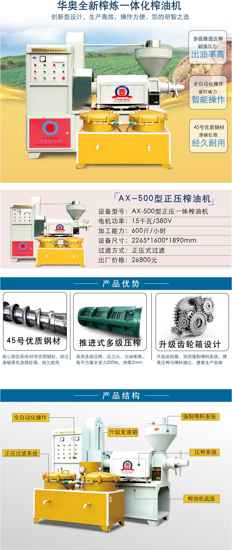3、出油率高:螺旋榨油機(jī)壓榨,每平方厘米壓力可達(dá)200噸,出油率高。