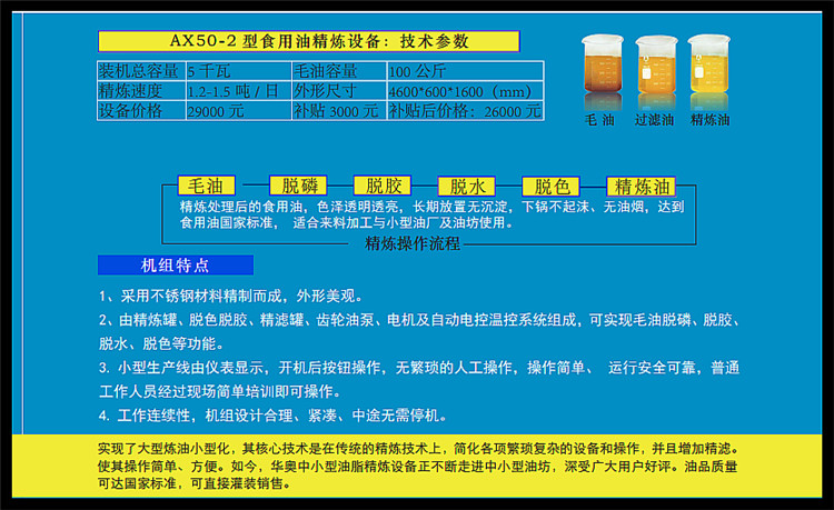 為滿足中小油坊的需要,華奧公司成功開發(fā)出專門用于【中小型油坊食用油精煉的小型成套生產(chǎn)線】,是針對(duì)中小油坊油脂精煉的一次重大變革,是一次油脂精煉的技術(shù)革新。實(shí)現(xiàn)了【脫磷、脫膠、脫水、脫色】一體化流水作業(yè),從而實(shí)現(xiàn)了大型煉油小型化,其核心技術(shù)是在傳統(tǒng)的精煉技術(shù)上,簡(jiǎn)化各項(xiàng)繁瑣復(fù)雜的設(shè)備和操作,并且增加精濾。使其操作簡(jiǎn)單、方便。如今,華奧中小型油脂精煉設(shè)備正不斷走進(jìn)中小型油坊,深受廣大用戶好評(píng)。油品質(zhì)量可達(dá)國(guó)家壓榨二級(jí)食用油標(biāo)準(zhǔn),可直接灌裝裝桶銷售。