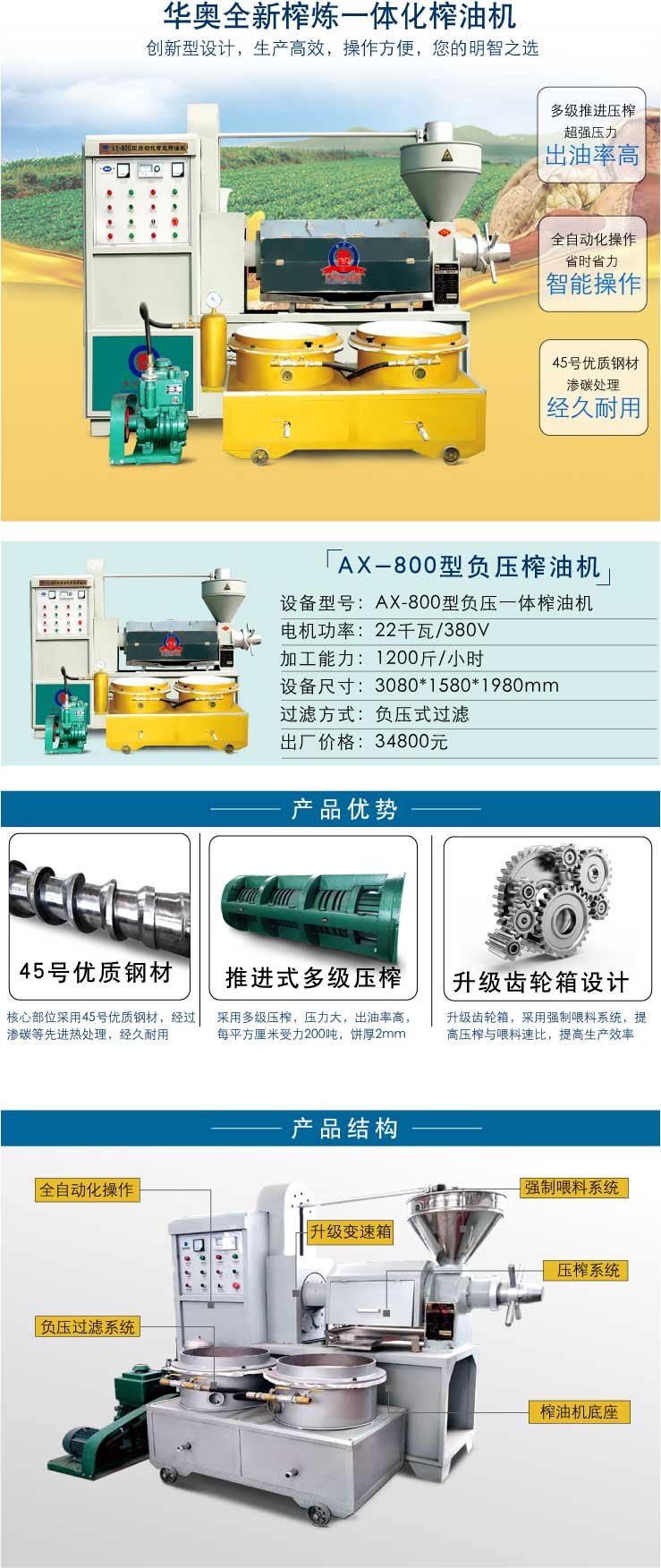 3、出油率高:螺旋榨油機壓榨,每平方厘米壓力可達200噸,出油率高。
