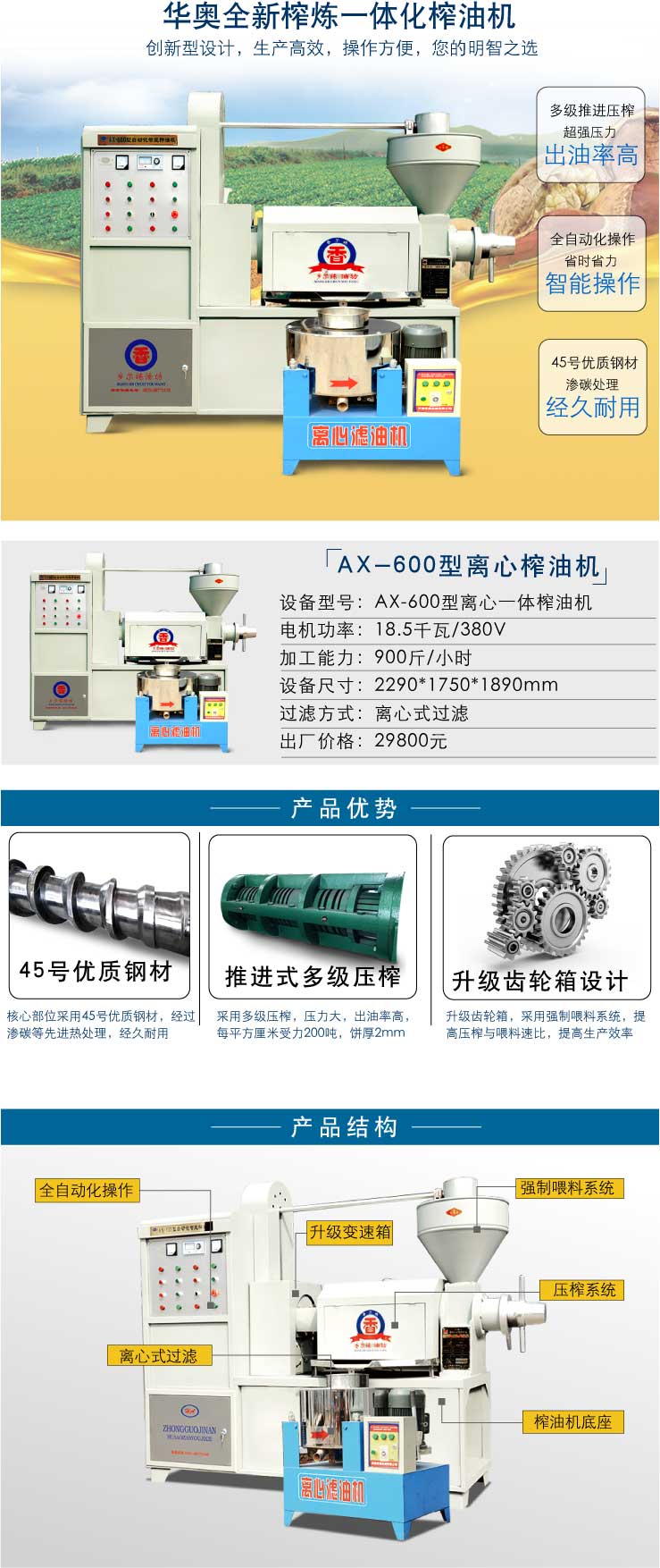 3、出油率高:螺旋榨油機壓榨,每平方厘米壓力可達200噸,出油率高。